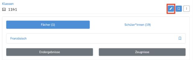 Bei Jahrgängen mit verschiedenen Halbjahren (z.B. Jahrgangsstufen 11 und 12) gilt zu beachten, dass für die entsprechenden Klassen kein Jahrgang zugeordnet wird. Um das einzustellen, klicken Sie auf die gewünschte Klasse. Es öffnet sich die Klassenübersicht. Klicken Sie jetzt auf den Stift in der rechten, oberen Ecke.
